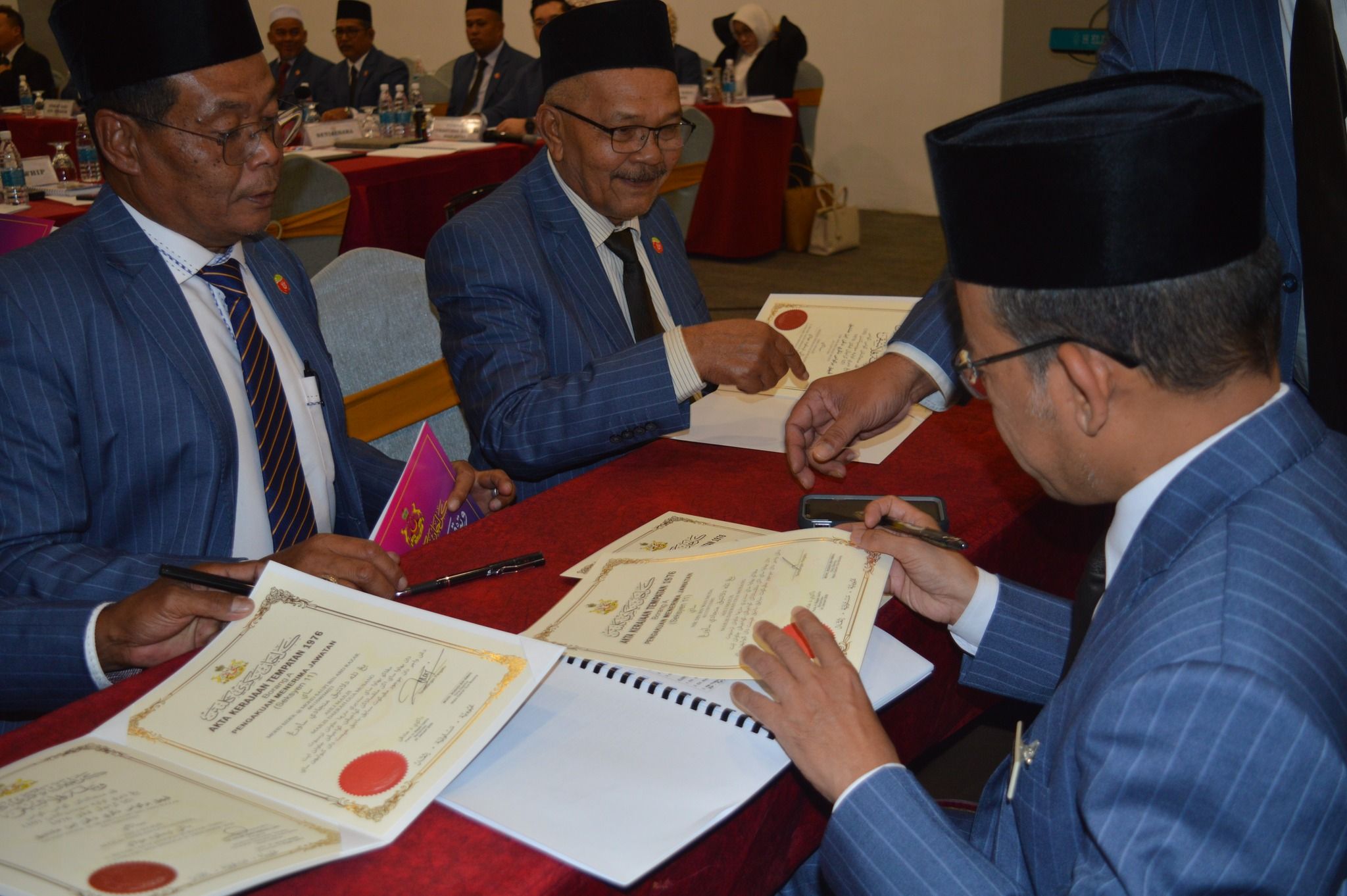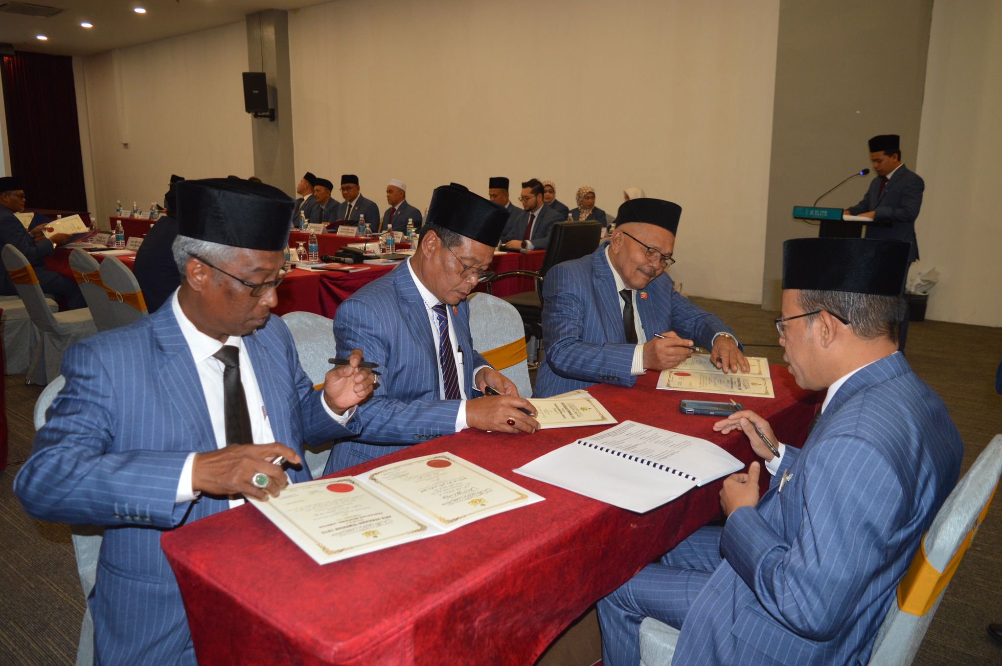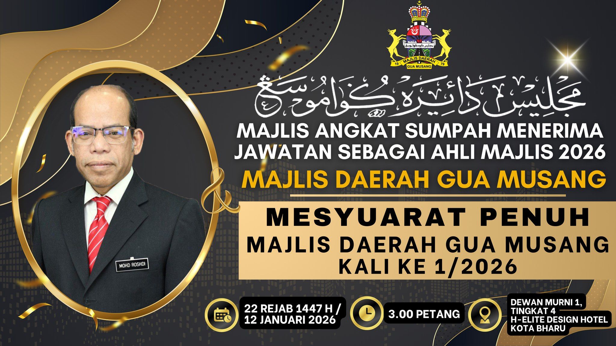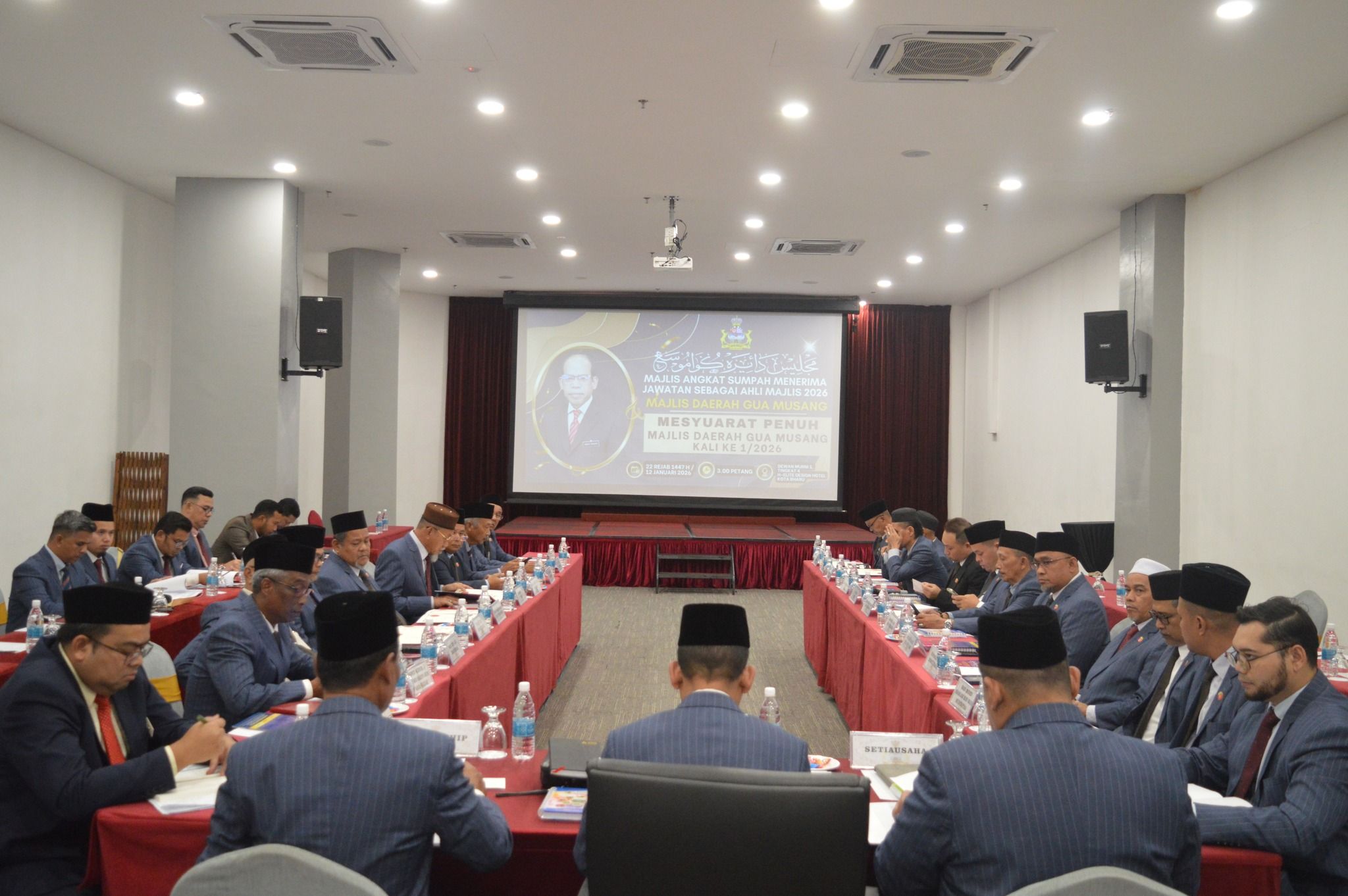 KOTA BHARU, 12 JANUARI 2026 – Majlis Mengangkat Sumpah dan Menandatangani Penerimaan Jawatan sebagai Ahli Majlis, Majlis Daerah Gua Musang bagi Tahun 2026 telah berlangsung dengan penuh tertib dan istiadat di H-Elite Design Hotel, Kota Bharu. Majlis tersebut telah disempurnakan di hadapan YABrs. Encik Mohd. Roshdi bin Ismail, Yang Dipertua Majlis Daerah Gua Musang. Majlis diteruskan dengan Mesyuarat Penuh MDGM Kali Ke-1/2026. Upacara ini merupakan satu simbolik penting yang menandakan penerimaan rasmi amanah dan tanggungjawab oleh Ahli-ahli Majlis yang dilantik bagi tempoh tahun 2026.